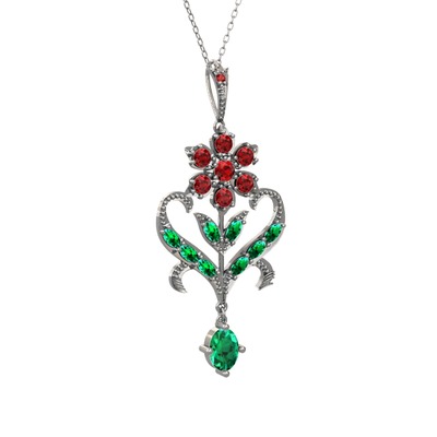 Garnet ve yeşil kuvars 14 ayar beyaz altın kolye (40 cm gümüş rolo zincir)