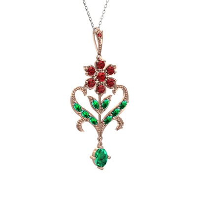 Garnet ve yeşil kuvars 14 ayar rose altın kolye (40 cm gümüş rolo zincir)
