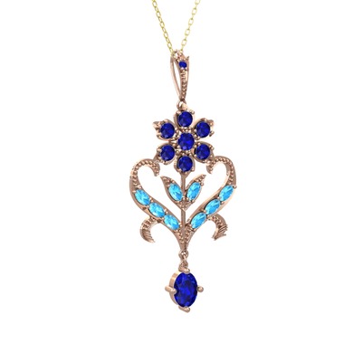 Lab safir ve akuamarin 8 ayar rose altın kolye (40 cm gümüş rolo zincir)