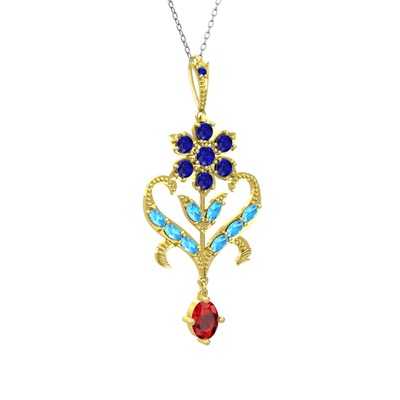Lab safir, akuamarin ve garnet 8 ayar altın kolye (40 cm beyaz altın rolo zincir)
