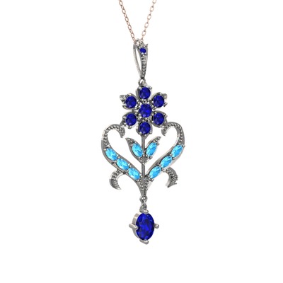 Lab safir ve akuamarin 925 ayar gümüş kolye (40 cm rose altın rolo zincir)