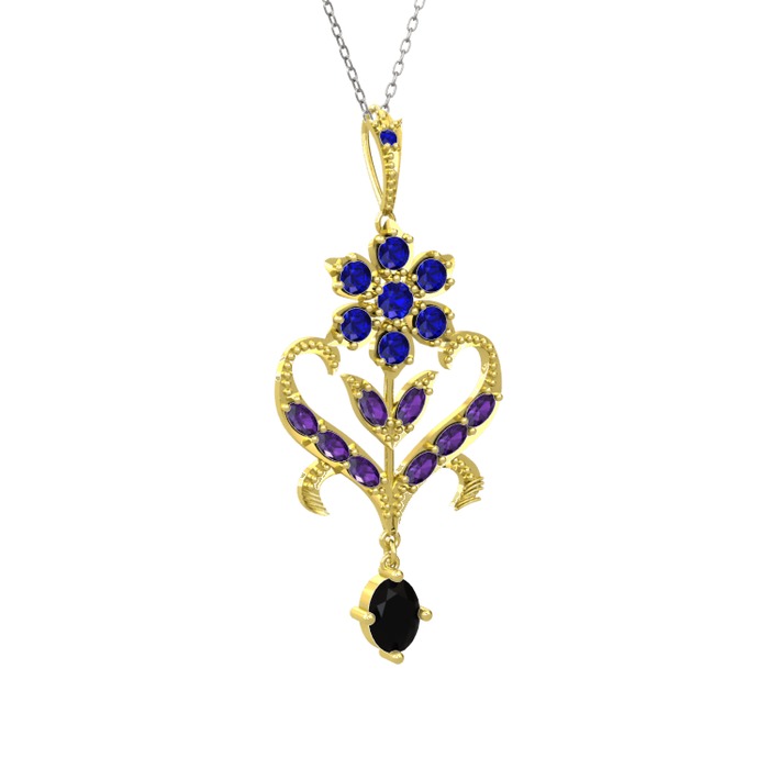 Lab safir, ametist ve siyah zirkon 14 ayar altın kolye (40 cm beyaz altın rolo zincir)