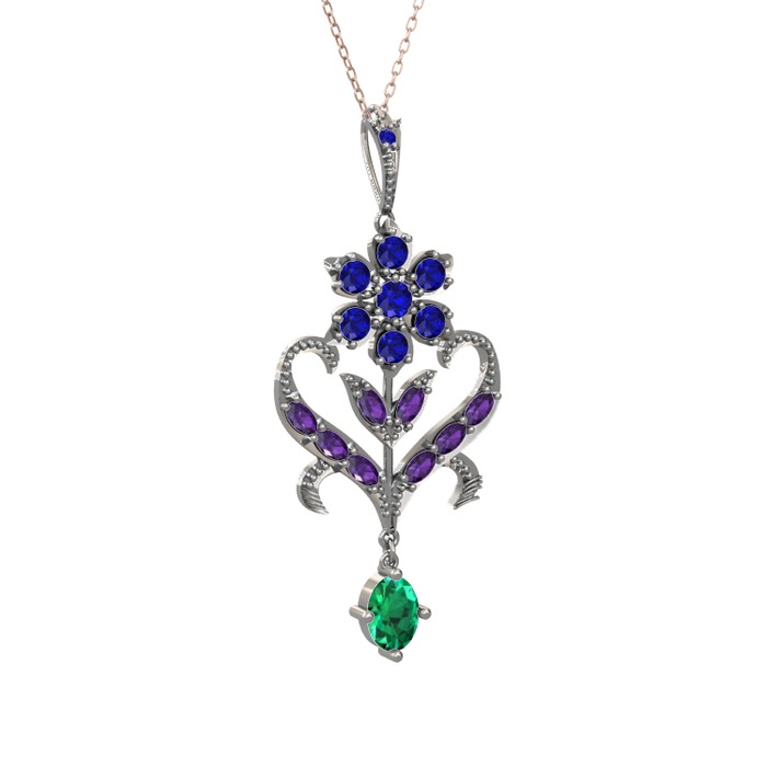 Lab safir, ametist ve yeşil kuvars 925 ayar gümüş kolye (40 cm rose altın rolo zincir)