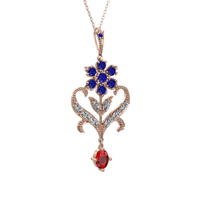 Lab safir, beyaz zirkon ve garnet 14 ayar rose altın kolye (40 cm rose altın rolo zincir)
