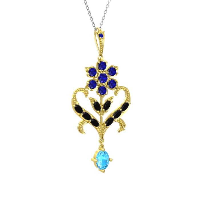 Lab safir, siyah zirkon ve akuamarin 8 ayar altın kolye (40 cm beyaz altın rolo zincir)