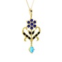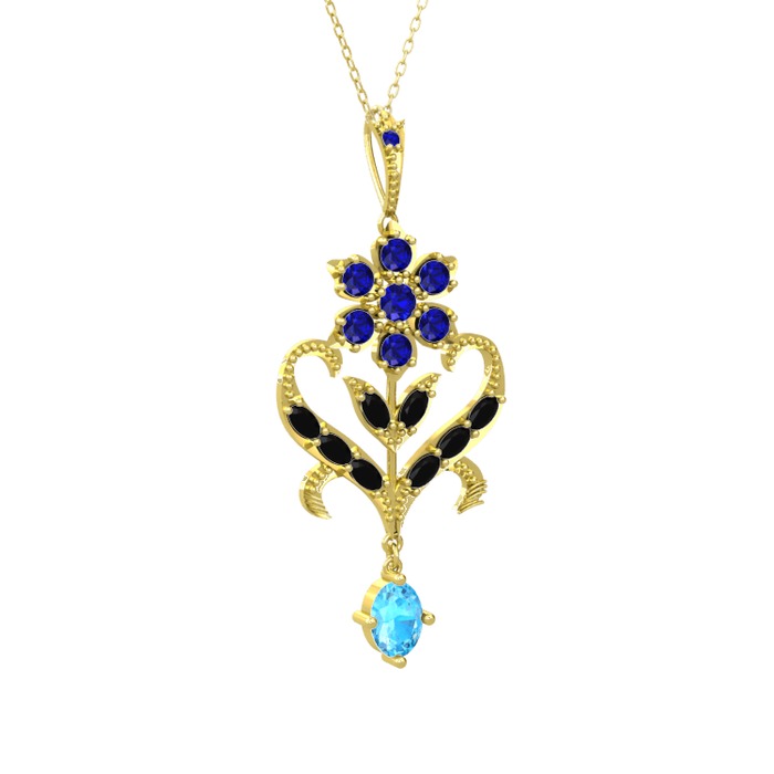 Lab safir, siyah zirkon ve akuamarin 8 ayar altın kolye (40 cm gümüş rolo zincir)