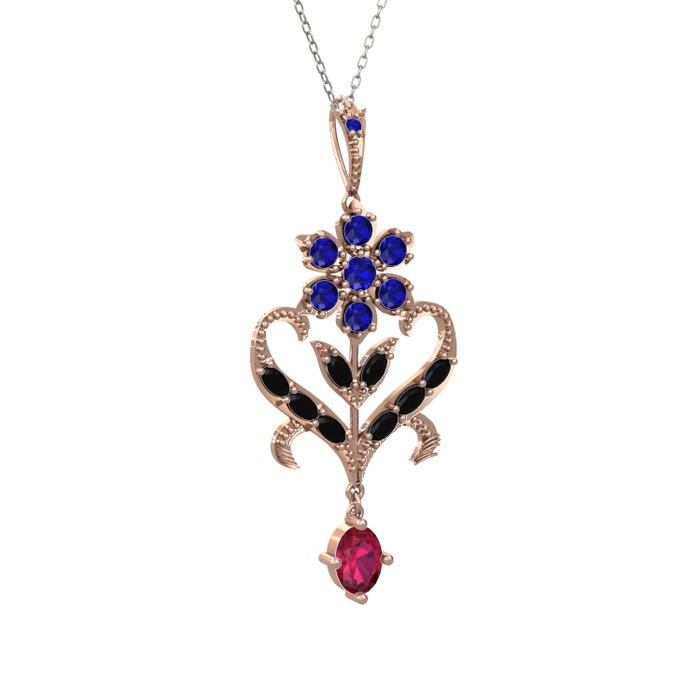Lab safir, siyah zirkon ve rodolit garnet 14 ayar rose altın kolye (40 cm beyaz altın rolo zincir)