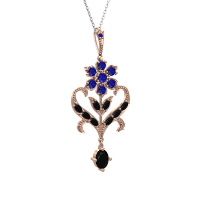 Lab safir ve siyah zirkon 925 ayar rose altın kaplama gümüş kolye (40 cm beyaz altın rolo zincir)