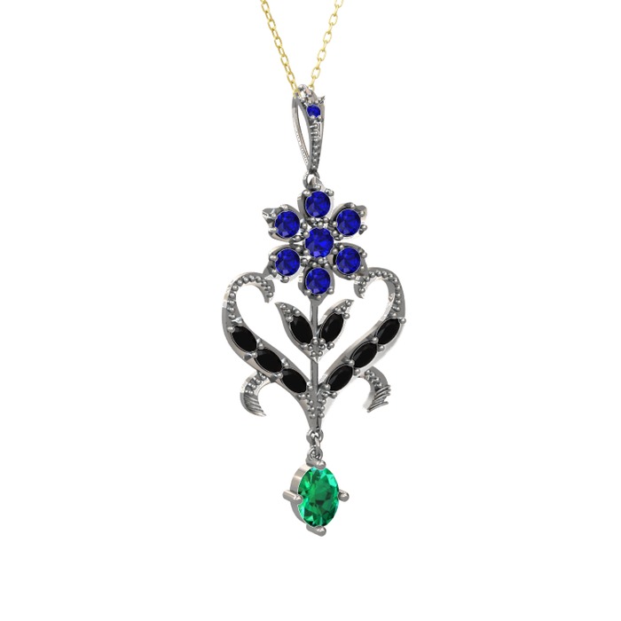 Lab safir, siyah zirkon ve yeşil kuvars 14 ayar beyaz altın kolye (40 cm gümüş rolo zincir)