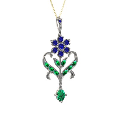 Lab safir ve yeşil kuvars 8 ayar beyaz altın kolye (40 cm gümüş rolo zincir)