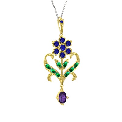 Lab safir, yeşil kuvars ve ametist 8 ayar altın kolye (40 cm beyaz altın rolo zincir)