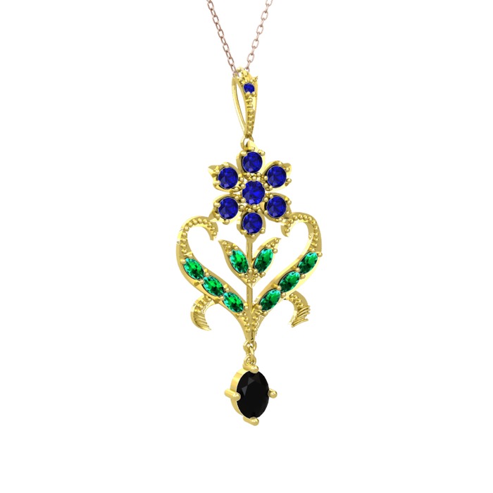 Lab safir, yeşil kuvars ve siyah zirkon 14 ayar altın kolye (40 cm rose altın rolo zincir)