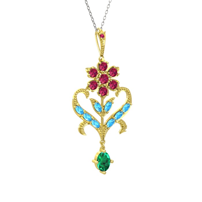 Rodolit garnet, akuamarin ve yeşil kuvars 14 ayar altın kolye (40 cm beyaz altın rolo zincir)