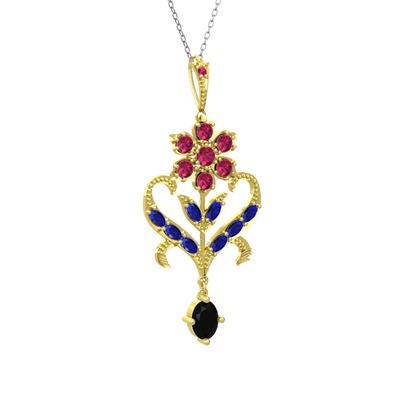 Rodolit garnet, lab safir ve siyah zirkon 925 ayar altın kaplama gümüş kolye (40 cm gümüş rolo zincir)