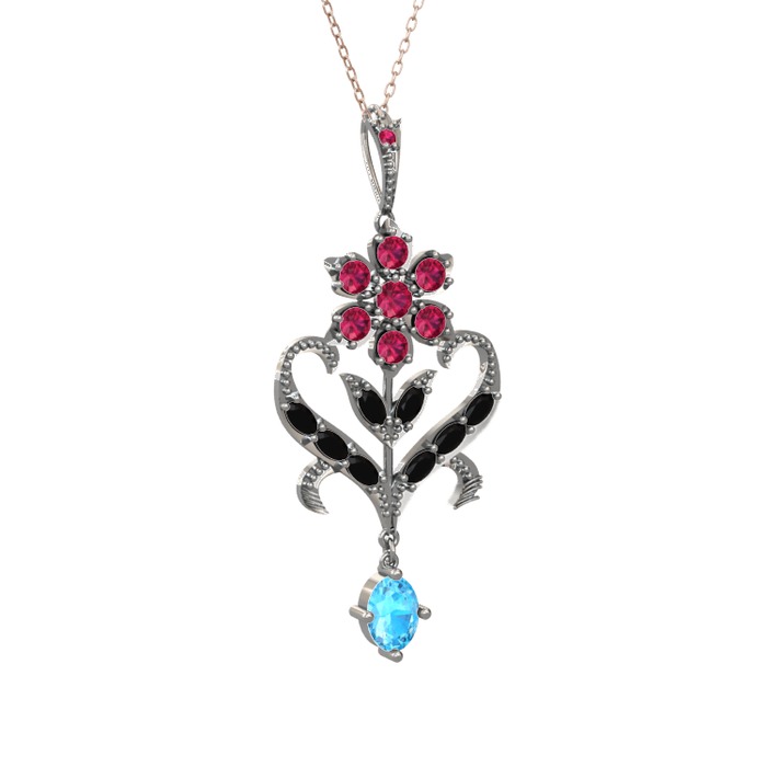 Rodolit garnet, siyah zirkon ve akuamarin 8 ayar beyaz altın kolye (40 cm gümüş rolo zincir)