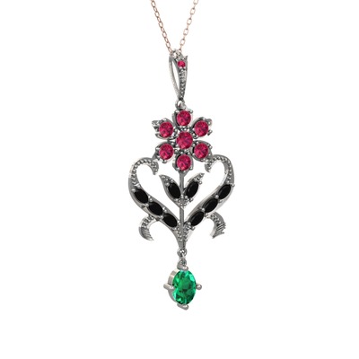 Rodolit garnet, siyah zirkon ve yeşil kuvars 925 ayar gümüş kolye (40 cm gümüş rolo zincir)