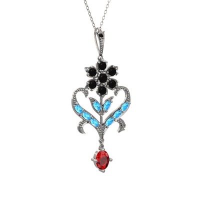 Siyah zirkon, akuamarin ve garnet 8 ayar beyaz altın kolye (40 cm gümüş rolo zincir)