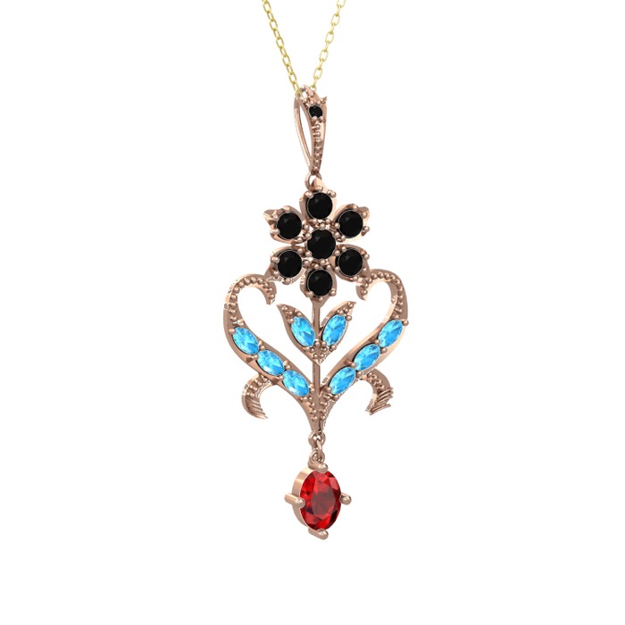 Siyah zirkon, akuamarin ve garnet 8 ayar rose altın kolye (40 cm gümüş rolo zincir)