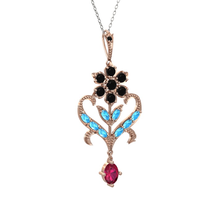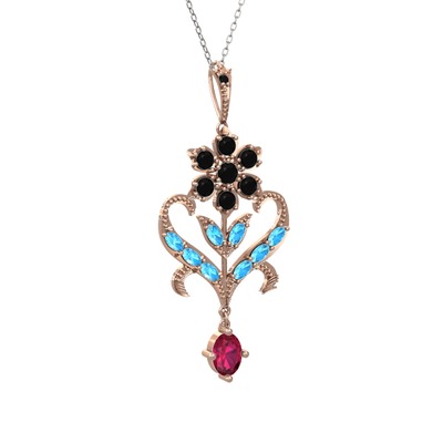 Siyah zirkon, akuamarin ve rodolit garnet 14 ayar rose altın kolye (40 cm beyaz altın rolo zincir)