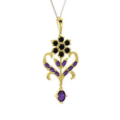Siyah zirkon ve ametist 925 ayar altın kaplama gümüş kolye (40 cm gümüş rolo zincir)