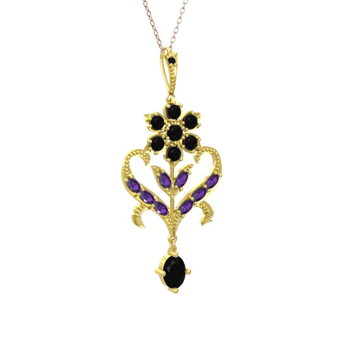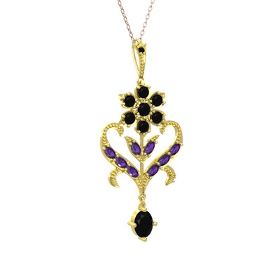 Siyah zirkon ve ametist 925 ayar altın kaplama gümüş kolye (40 cm rose altın rolo zincir)