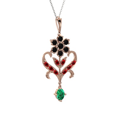 Siyah zirkon, garnet ve yeşil kuvars 8 ayar rose altın kolye (40 cm beyaz altın rolo zincir)