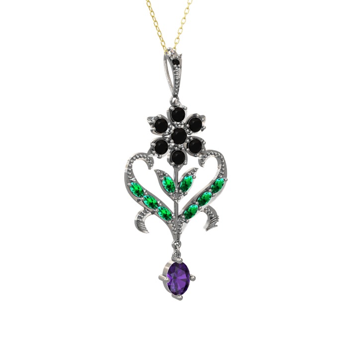 Siyah zirkon, yeşil kuvars ve ametist 925 ayar gümüş kolye (40 cm altın rolo zincir)