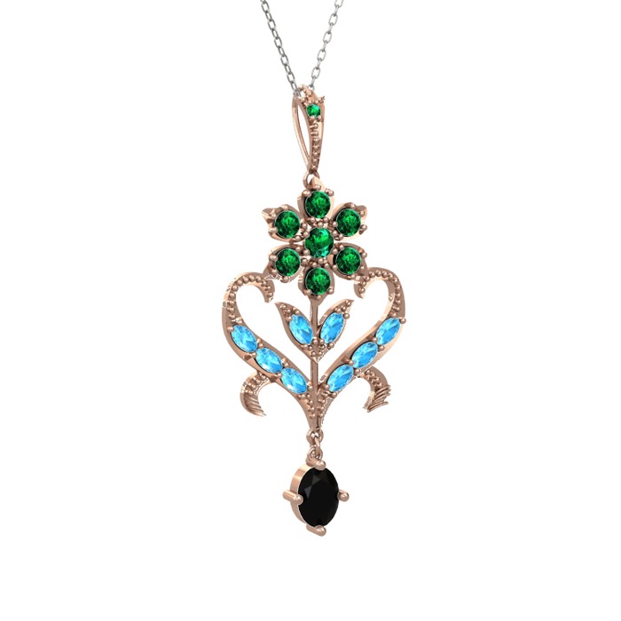 Yeşil kuvars, akuamarin ve siyah zirkon 925 ayar rose altın kaplama gümüş kolye (40 cm gümüş rolo zincir)