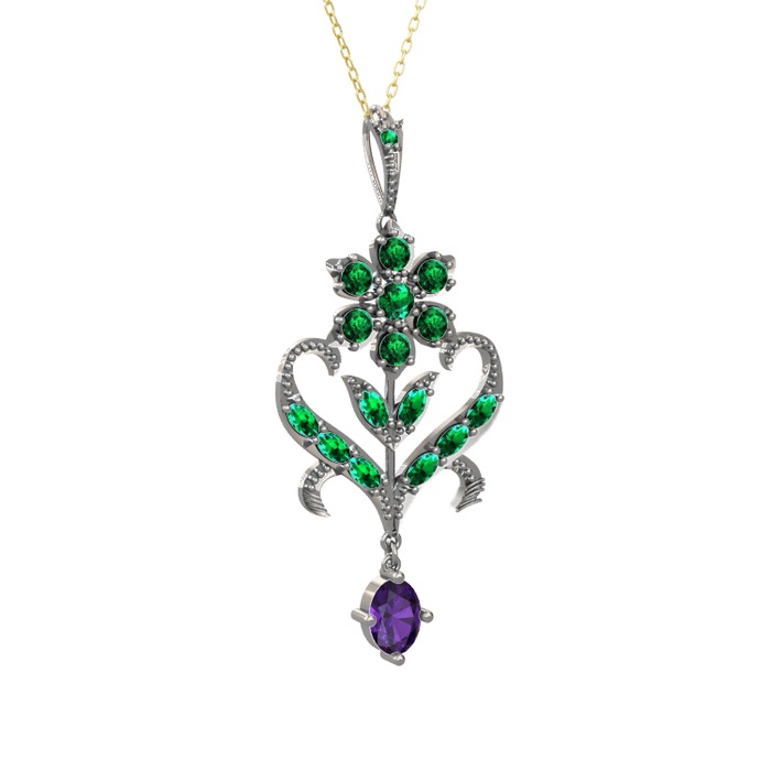 Yeşil kuvars ve ametist 925 ayar gümüş kolye (40 cm altın rolo zincir)