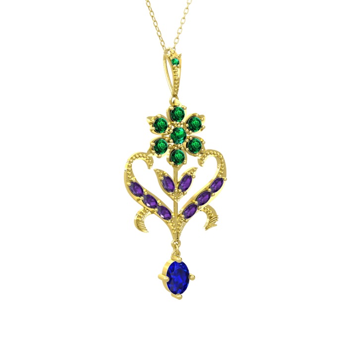 Yeşil kuvars, ametist ve lab safir 925 ayar altın kaplama gümüş kolye (40 cm altın rolo zincir)