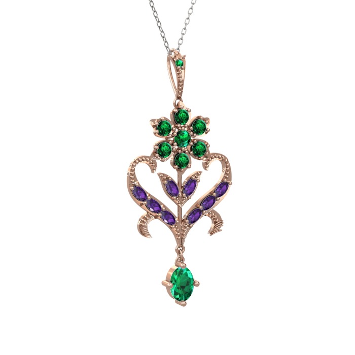Yeşil kuvars ve ametist 925 ayar rose altın kaplama gümüş kolye (40 cm gümüş rolo zincir)