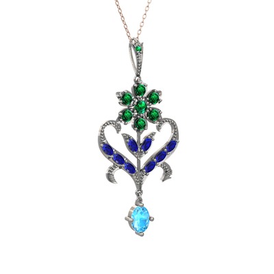 Yeşil kuvars, lab safir ve akuamarin 14 ayar beyaz altın kolye (40 cm rose altın rolo zincir)