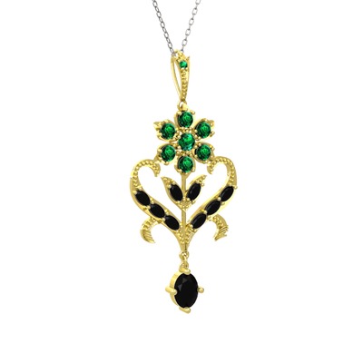 Yeşil kuvars ve siyah zirkon 925 ayar altın kaplama gümüş kolye (40 cm gümüş rolo zincir)