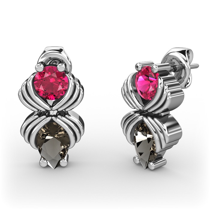 Dumanlı kuvars ve rodolit garnet 14 ayar beyaz altın küpe