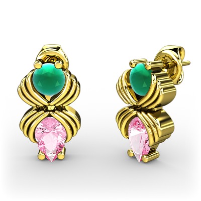 Pembe kuvars ve kök zümrüt 8 ayar altın küpe