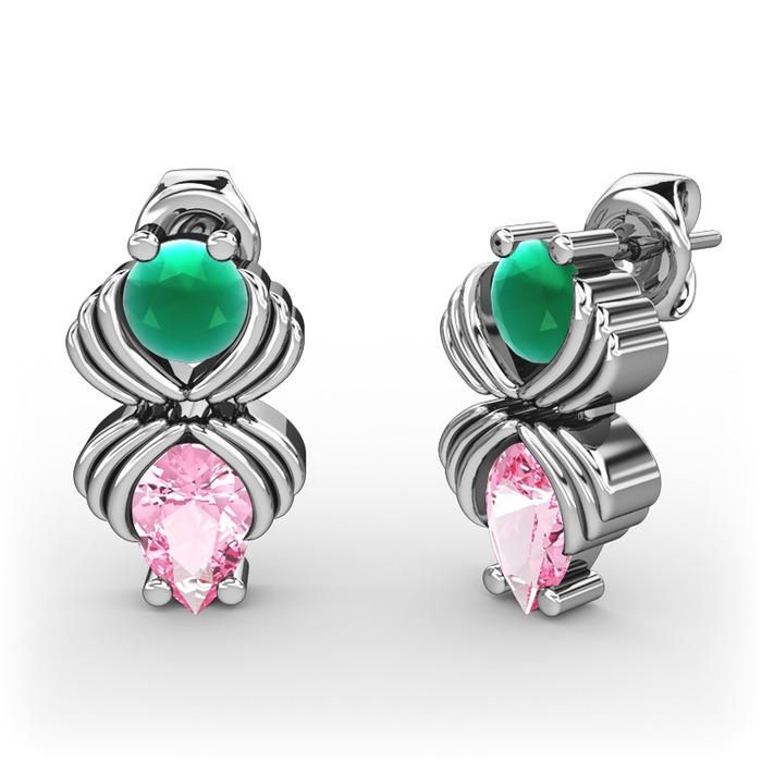 Pembe kuvars ve kök zümrüt 8 ayar beyaz altın küpe