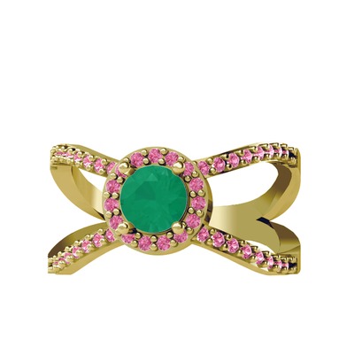 Kök zümrüt ve pembe kuvars 14 ayar altın yüzük