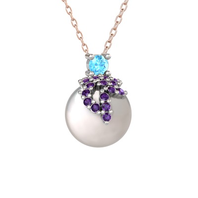Akuamarin, ametist ve inci 14 ayar beyaz altın kolye (40 cm rose altın rolo zincir)