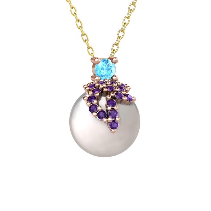 Akuamarin, ametist ve inci 14 ayar rose altın kolye (40 cm altın rolo zincir)