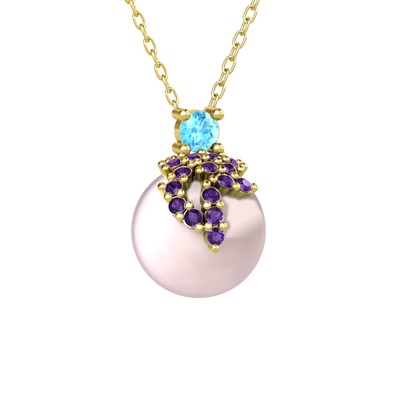 Akuamarin, ametist ve pembe inci 18 ayar altın kolye (40 cm altın rolo zincir)