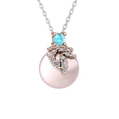 Akuamarin, beyaz zirkon ve pembe inci 8 ayar rose altın kolye (40 cm beyaz altın rolo zincir)
