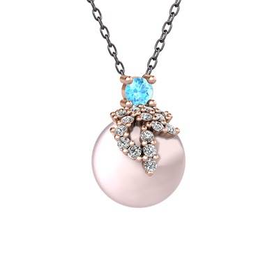 Akuamarin, beyaz zirkon ve pembe inci 8 ayar rose altın kolye (40 cm gümüş rolo zincir)