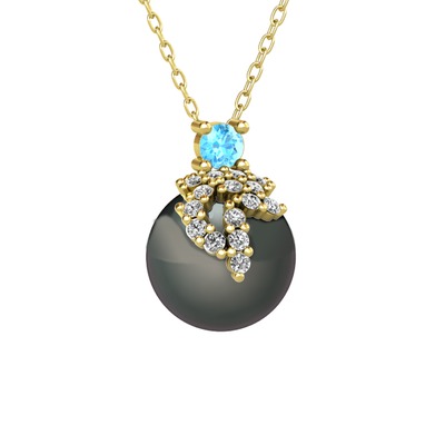 Akuamarin, beyaz zirkon ve siyah inci 14 ayar altın kolye (40 cm gümüş rolo zincir)