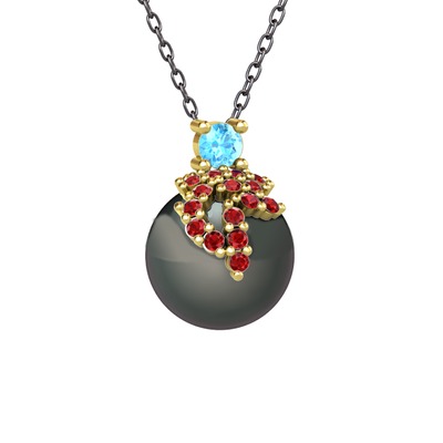 Akuamarin, garnet ve siyah inci 14 ayar altın kolye (40 cm gümüş rolo zincir)