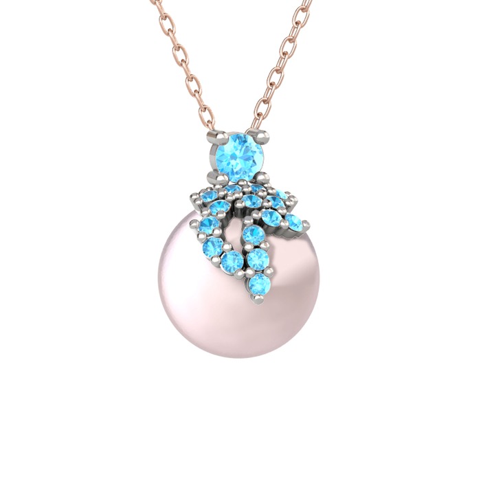 Akuamarin ve pembe inci 14 ayar beyaz altın kolye (40 cm rose altın rolo zincir)