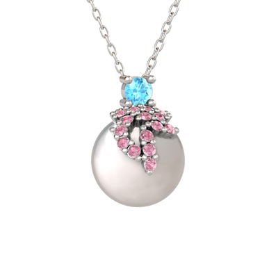 Akuamarin, pembe kuvars ve inci 14 ayar beyaz altın kolye (40 cm gümüş rolo zincir)