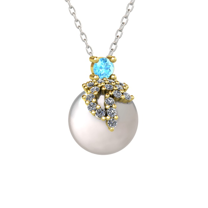 Akuamarin, pırlanta ve inci 8 ayar altın kolye (0.176 karat, 40 cm gümüş rolo zincir)