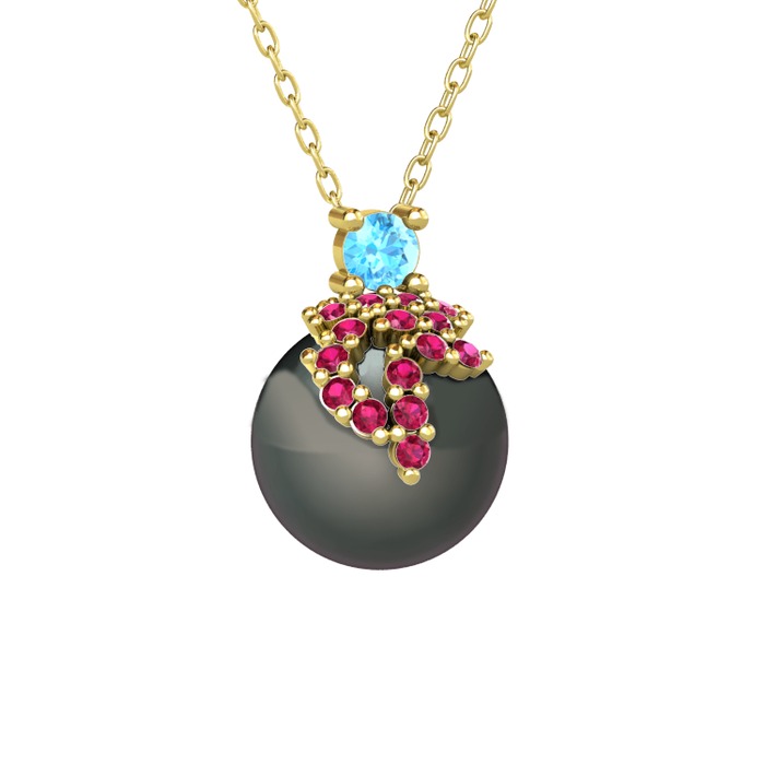 Akuamarin, rodolit garnet ve siyah inci 925 ayar altın kaplama gümüş kolye (40 cm altın rolo zincir)