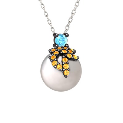 Akuamarin, sitrin ve inci 925 ayar siyah rodyum kaplama gümüş kolye (40 cm beyaz altın rolo zincir)