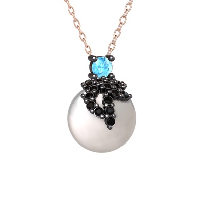Akuamarin, siyah zirkon ve inci 925 ayar siyah rodyum kaplama gümüş kolye (40 cm gümüş rolo zincir)